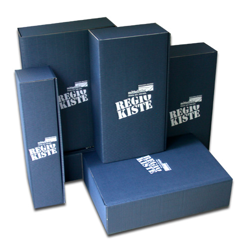 Unsere Präsentkisten (für zwei bis drei Flaschen) sind innen und außen saphirblau gefärbt, aus recycelter Pappe und mit Logoeindruck versehen.